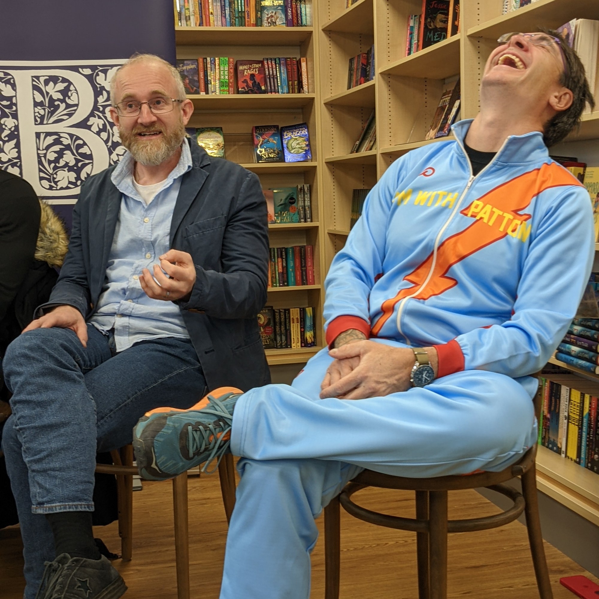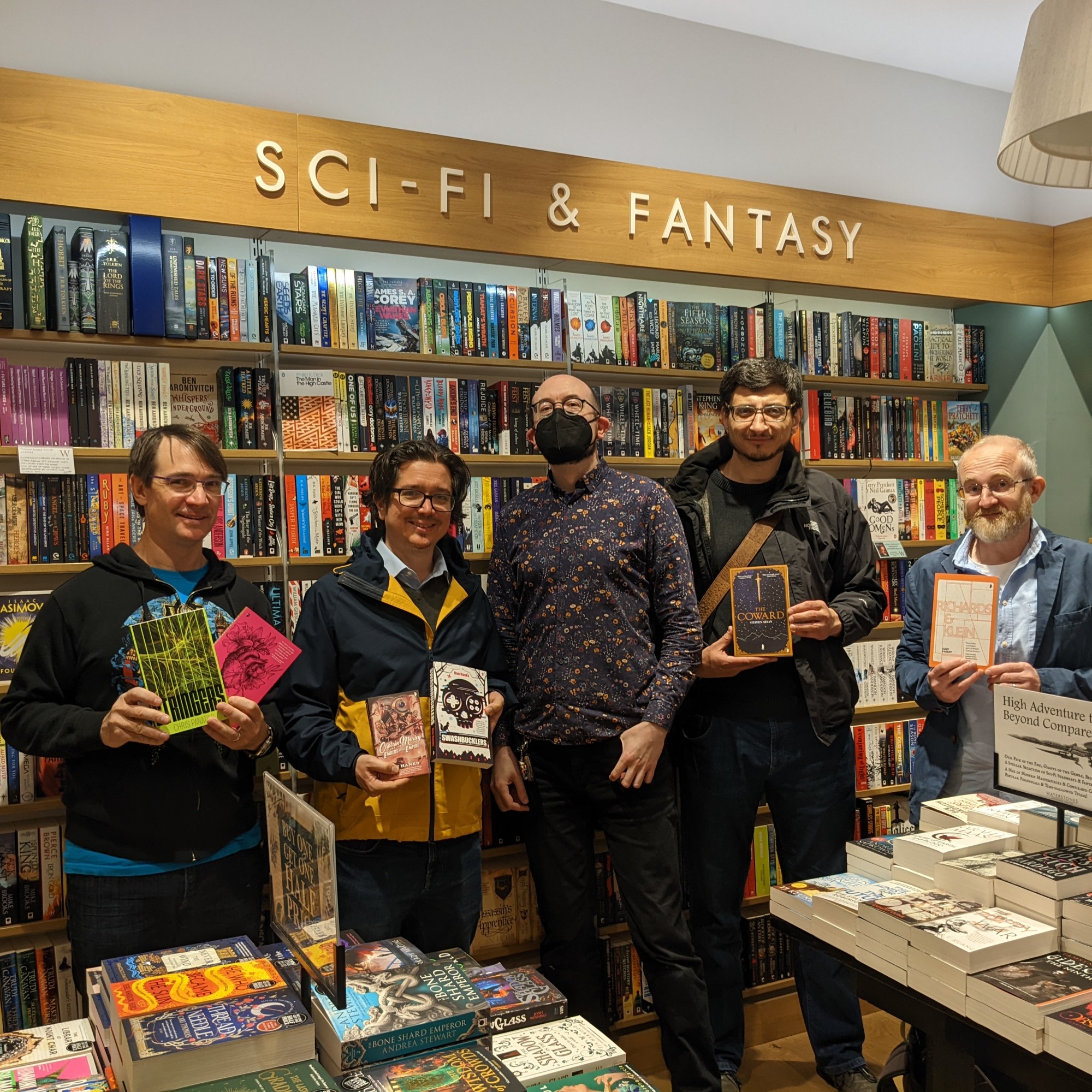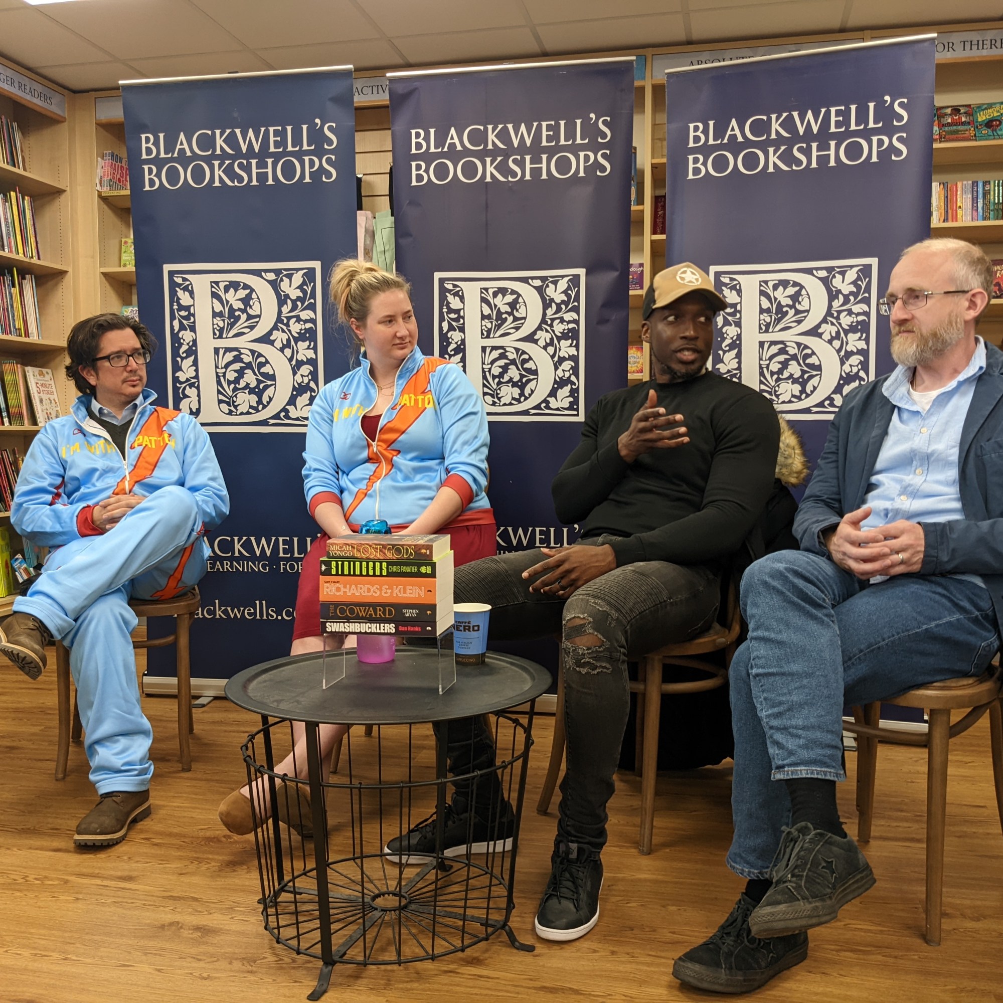 Then we went over to Blackwell’s bookshop in the evening where Guy Haley, Dan Hanks, Micah Yongo, Chris Panatier and myself were interviewed by Gemma Creffield, from Angry Robot books. We had a lot of fun talking about story, craft and worldbuilding. And if you’re wondering about the matching tracksuits, they all say I’m with Patton, which is a reference to something from Chris’s book, Stringers! I suggested we all dress in matching outfits like The Beastie Boys and come out to Intergalactic blasting from the speakers, but I was outvoted. Nevertheless, we had a great evening!