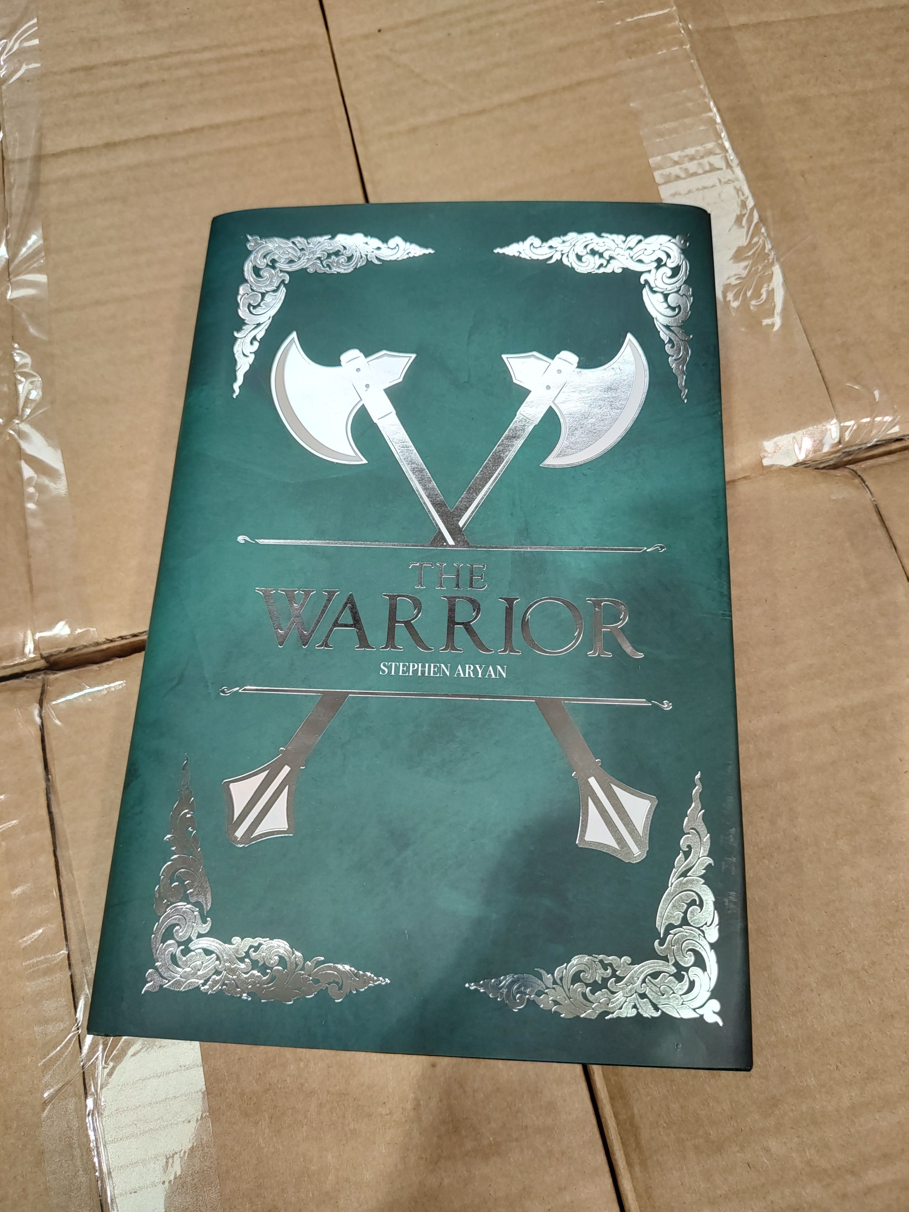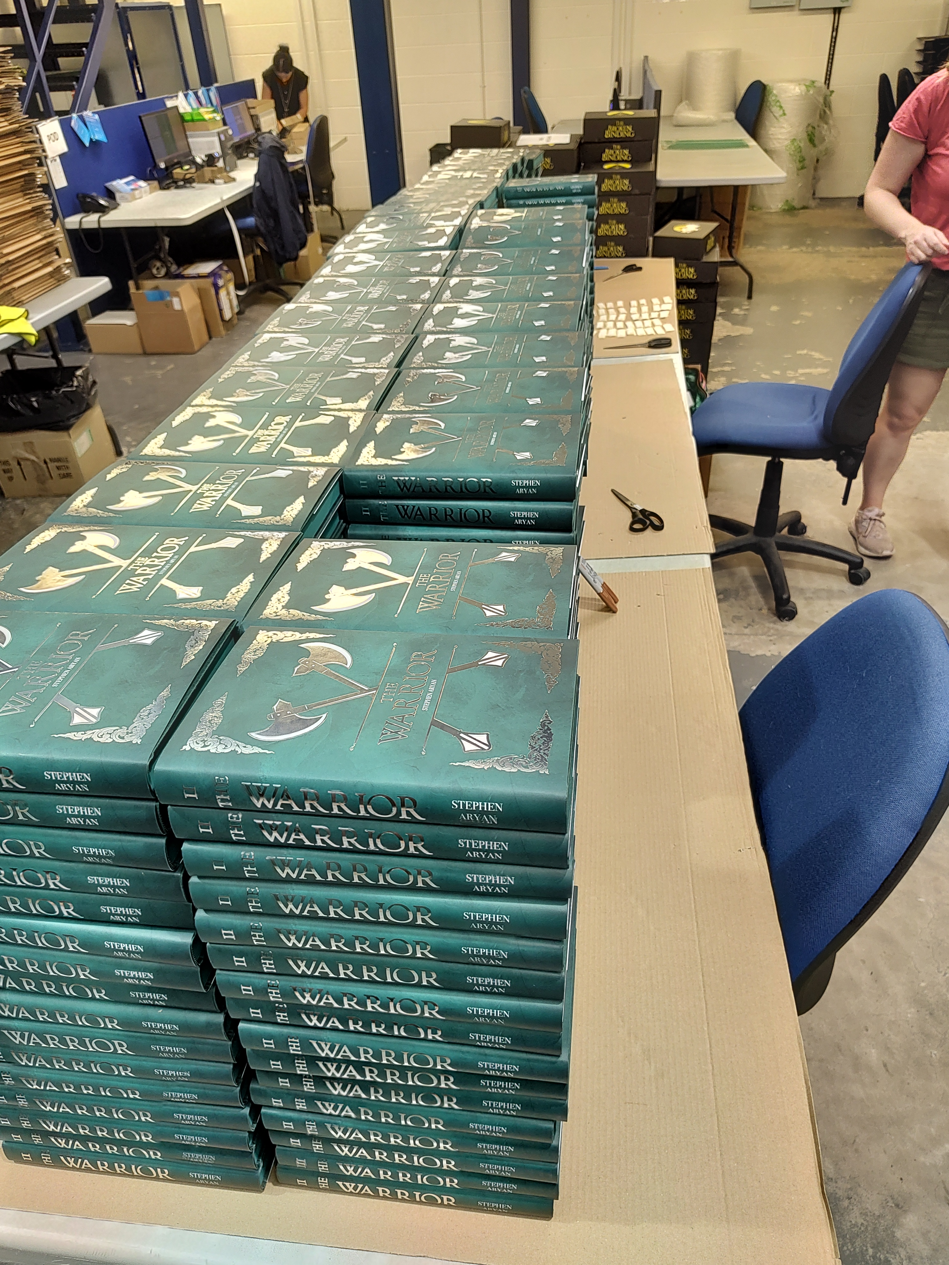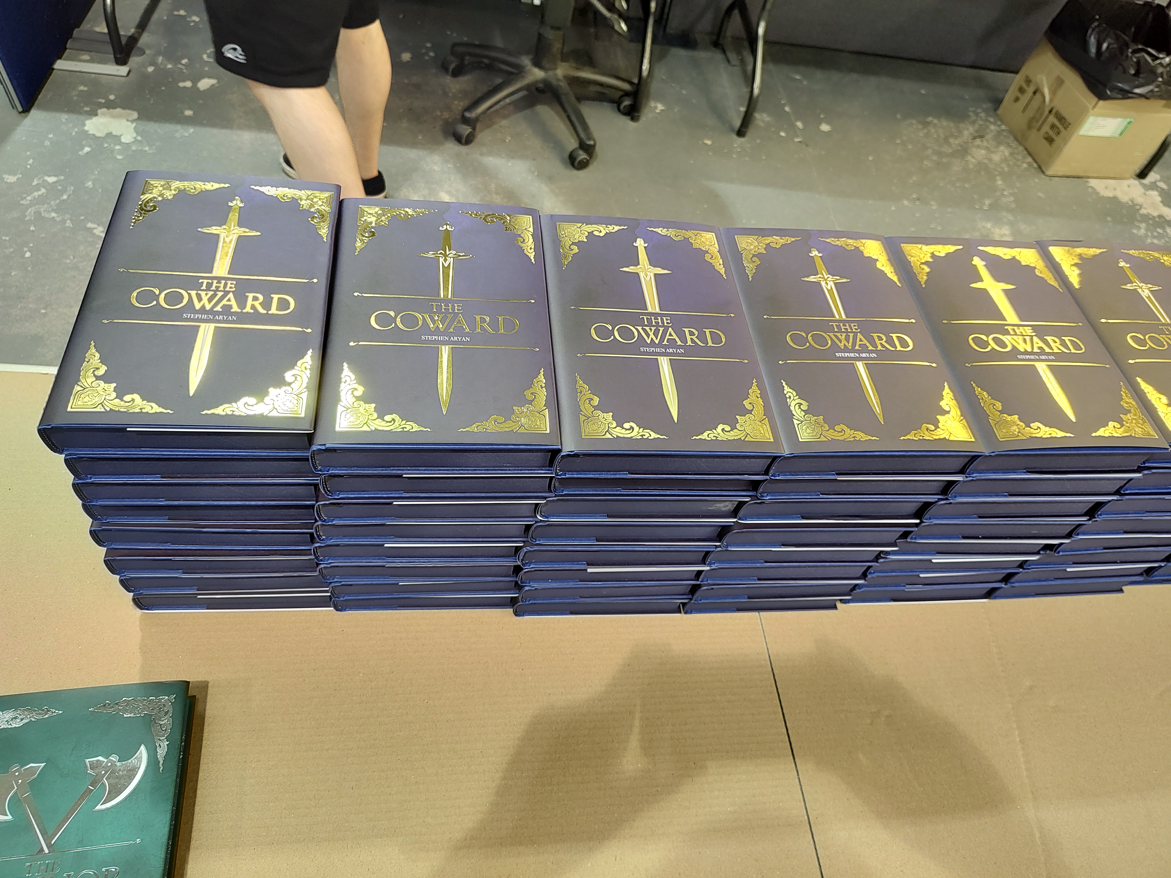First of all, the special limited edition hardback versions of The Coward and The Warrior. These have been printed and recently I spent most of a day at the fulfilment centre signing the 500 copies of each. Here’s the great wall of each and a signed palette of The Coward. There is a limited number still available. As of writing there are about 40 left. The sets are available to purchase now from The Broken Binding website.